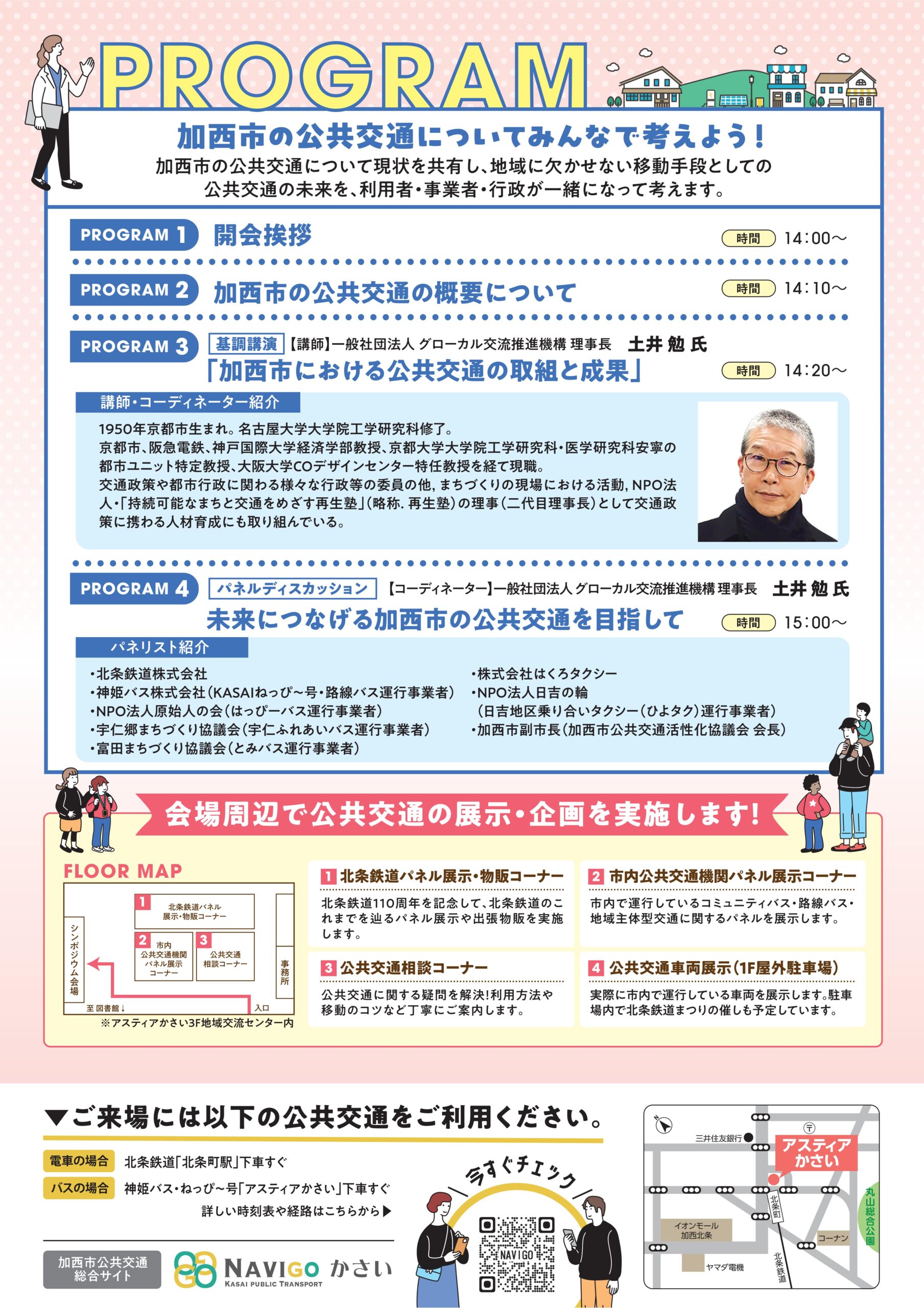 This symposium will consider the future vision of public transportation appropriate for Kasai City through lectures by experts, sharing of the current state of public transportation in the city, and panel discussions to hear the opinions of citizens.