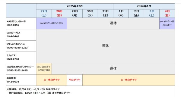 加西市内の公共交通 年末年始(12/27㈯~1/4㈰)の運行状況は下記のとおりです。